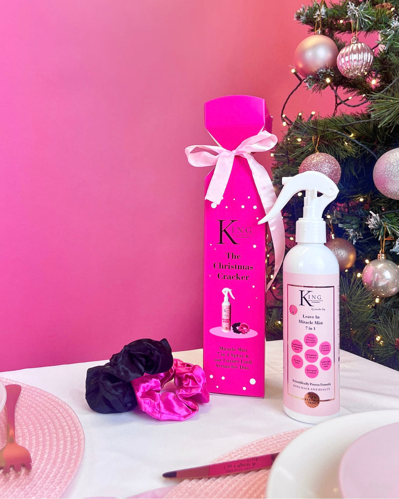 Crack the code to your haircare this Christmas with our Christmas Cracker. Includes our best-selling Miracle Mist 7 in 1 Spray along with our Luxury Lush Scrunchie Duo.
